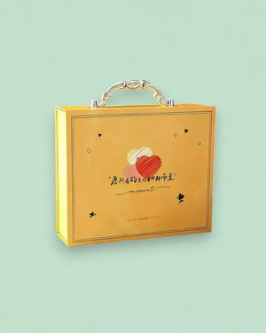 This book-shaped handle chocolate gift box features a sturdy metal handle that enhances portability while adding a refined decorative element. The structured body is crafted from rigid board, offering durability and a premium hand feel. Its compact form allows chocolates to be arranged securely inside, making it suitable for upscale confectionery collections and festive gifting programs. Surface finish, handle style, interior layout, and branding details can be customized. Minimum order quantity: 1000 pieces.